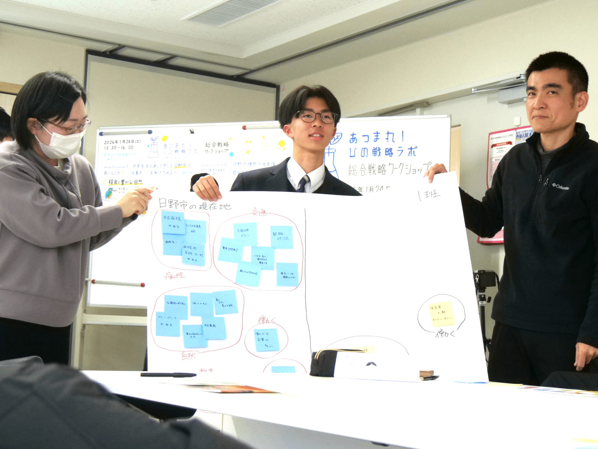 ・最後に、参加者のみなさんで集合写真を撮影しました。今後も第2回、第3回とワークショップは続きます。より良い日野の実現に向けて、引き続き一緒に対話していきましょう!
