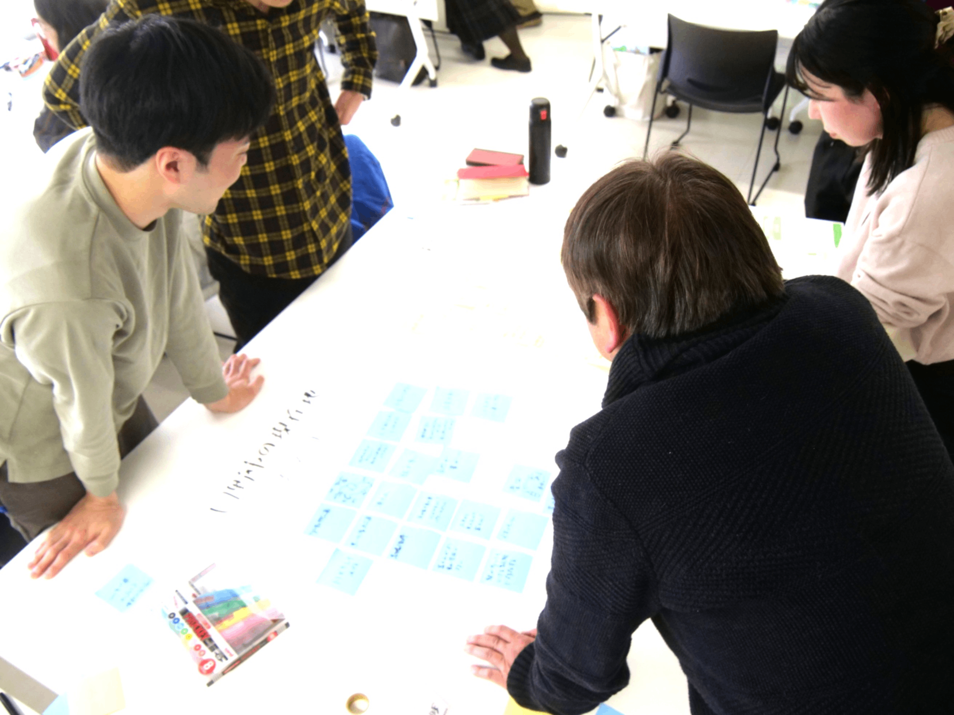 ・ワークシートや付箋を模造紙に貼り付けながら、グループで議論しました。